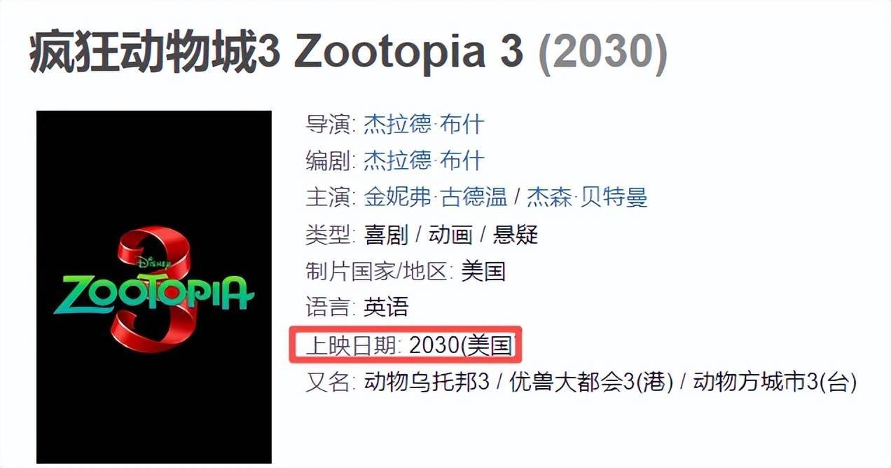 根据《疯狂动物城2》的结尾我们可以断定,未来肯定会有《疯狂动物城3》。而据国内的一些电影平台所显示,《疯狂动物城3》大概率会定于2030年上映,距今还有五年时间。