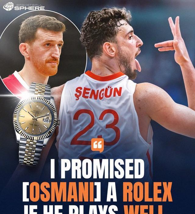 对阵希腊的半决赛后,申京当时透露:“我之前跟奥斯曼尼说过,如果他打得好,就送他一块劳力士。我会给他挑最好的那一款。”奥斯曼尼成为那场比赛的功臣,他在比赛前10分钟便砍下14分,全场最终以28分收官,创下个人国际赛事得分新高。此外,他还和申京联手限制了字母哥的发挥,让这位希腊超巨只得到12分。土耳其最终94-68大胜希腊。